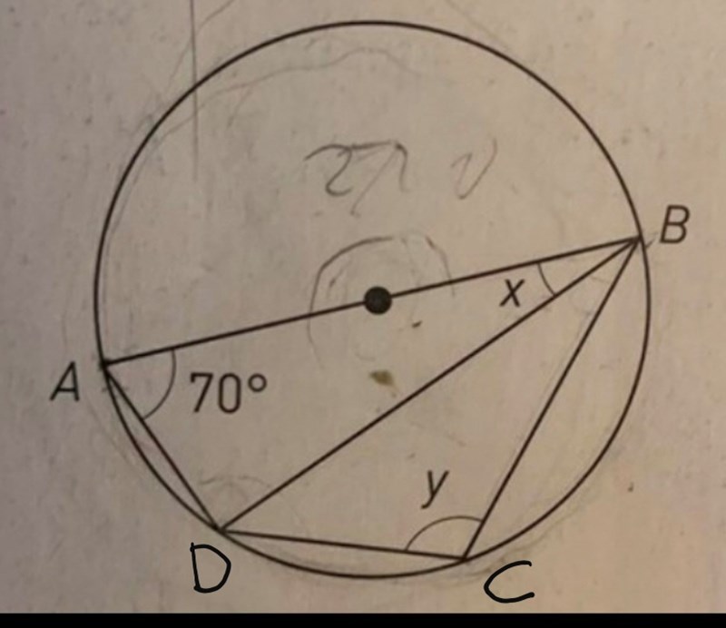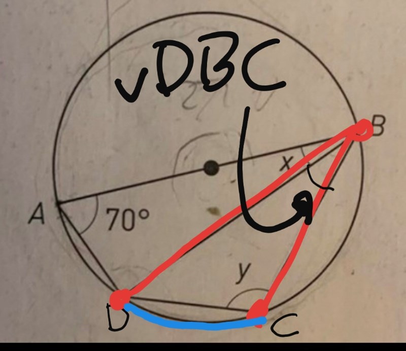 - Från B utgår de tre kordorna BA, BD och BC. Här finns alltså tre randvinklar, nämligen vABD (dvs x), vABC och vDBC.