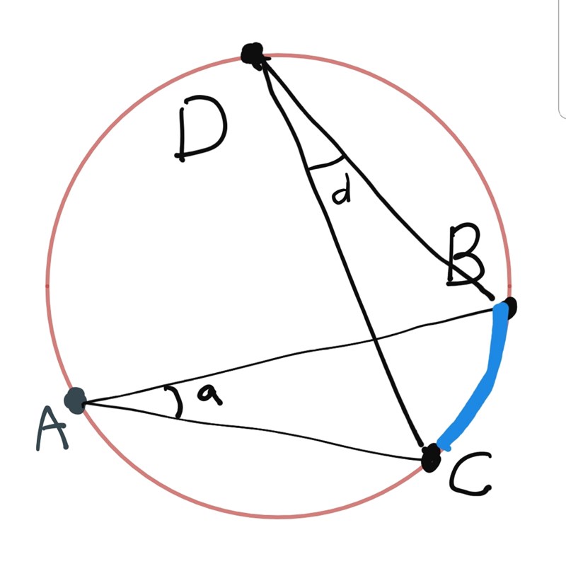 Alla randvinklar som är motstående samma cirkelbåge är lika stora. Det följer av randvinkelsatsen. Det betyder att randvinkeln d är lika stor som a: