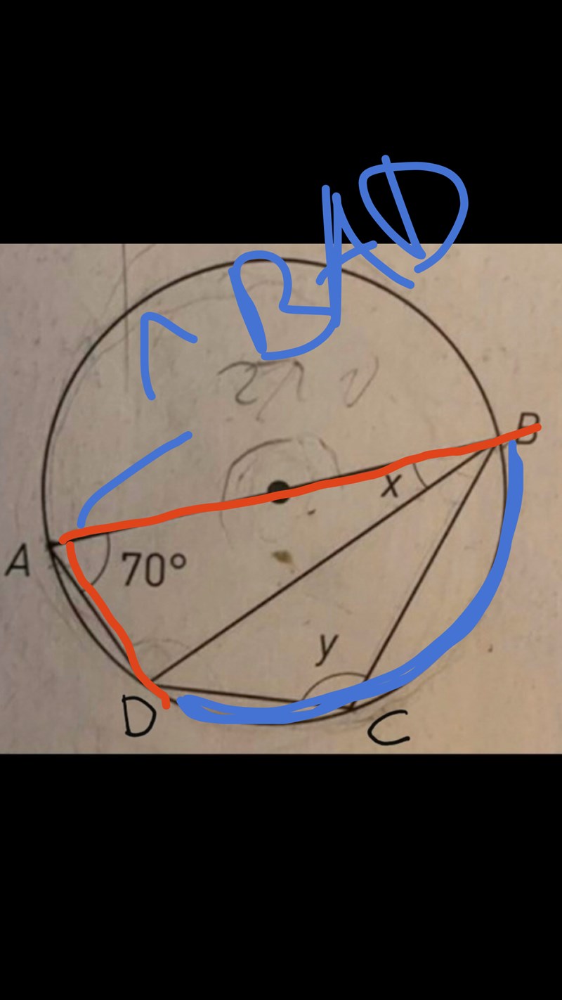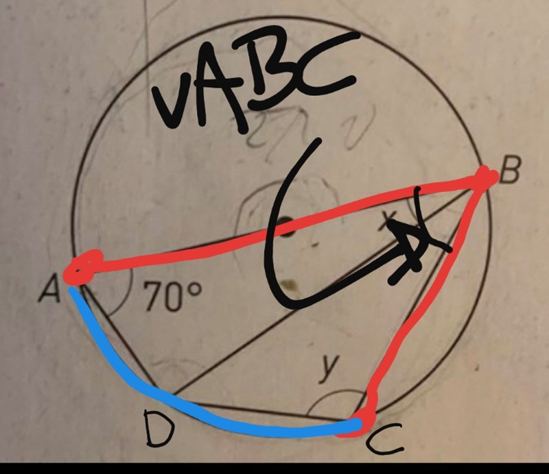 - Från A utgår endast de två kordorna AB och AD. Här finns alltså endast en randvinkel, nämligen vBAD (som är 70°).
