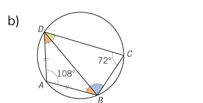 Fyrhörningen ABCD är inskriven i en cirkel. ∧ABD=∧ADB och ∧C=72°