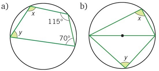 Till att börja med är x + y = 180° eftersom fyrhörningen är inskriven i en cirkel.