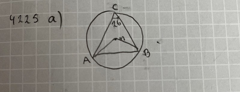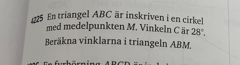 Bestäm vinkel AMB med randvinkelsatsen. Du har skrivit 26o i figuren, det står 28o i uppgiften.