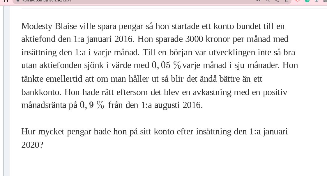 Modesty hade (3000(0,9995⁷-1))/(0,9995-1) på sitt konto efter 7 månader (den 31:a juli 2016), men denna summa utvecklade vidare i 42 månader, och det är därför att man måste multiplicera den med 1,00941 (och jag har insett att det måste också multipliceras med 0,9995).
