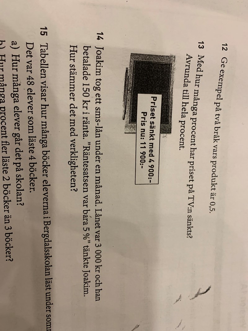 Fattar ej fråga 14. Det stämmer ju med verkligheten genom att 5% av 3000 är ju 150kr , men hur kan det vara ett A-svar?
