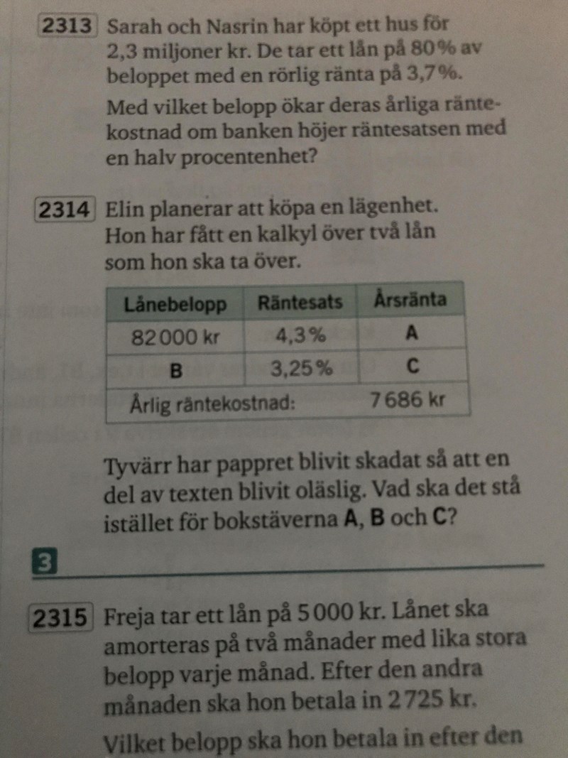 Hade någon kunnat hjälpa mig med 2314? Jag lyckades lösa A men B och C gick inte lika bra. Min lösning på A var : x = 0,043 * 82000 = 3526.