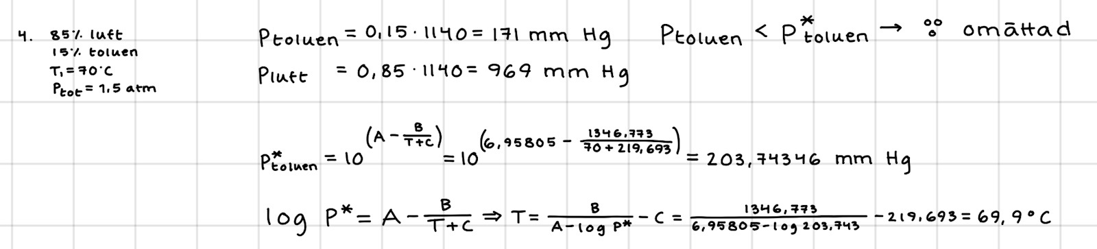 I facit skriver dem att de tar p*(toluen) i Antoines ekvation i sista steget men ändå tar de värdet för p(toluen). Varför ska jag använda p(toluen) och inte p* när det är så ekvationen är? Förstår ju att stoppar jag in samma värden så får jag ungefär samma svar (hehe temperaturen i de 2 sista stegen) men jag skulle inte förstått att det är p(toluen) jag skulle använt om det var på ett prov.