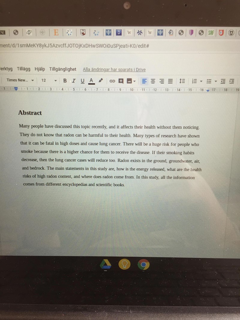 Hej, jag undrar om jag har fått med allt som en abstract borde innehålla. Jag skriver en rapport om var radon kommer ifrån, vilka hälsorisker som finns och hur mycket energi som frigörs när radium sönderfaller till radon.