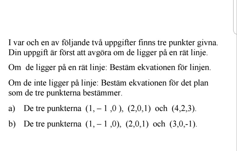 Jag önskar att få hjälp med att lösa denna uppgift. Jag vet att man ska sätta in x-, y-, och z-koordinaterna för de tre punkter k ekvationen ax+by+cz+d =0 , men tycker att det är lite krångligt  att komma längre än så.