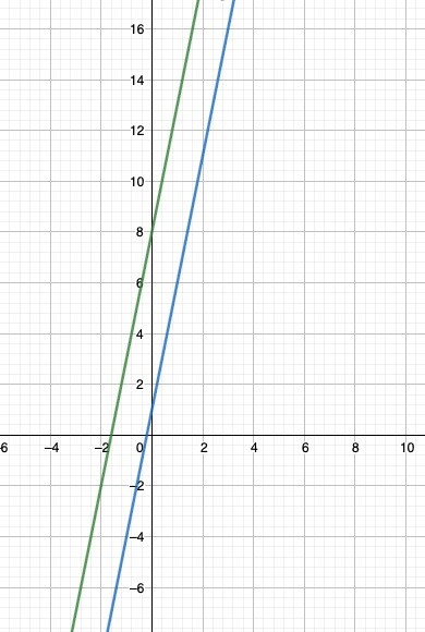 Den gröna linjen som du ser är y=5x+8 och den skär y-axeln vid (0,8). Den blåa linjen är y=5x+1 och den skär y-axeln vid (0,1)