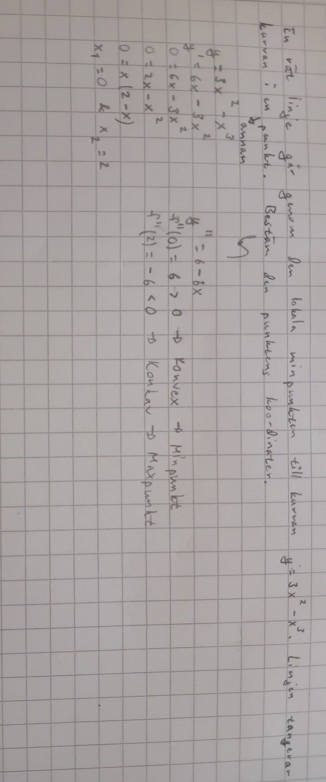 Uppgiften lyder såhär: En rät linje går genom den lokala minpunkten till kurvan y=3x^2-x^3. Linjen tangerar kurvan i en annan punkt. Bestäm den punktens koordinater.
