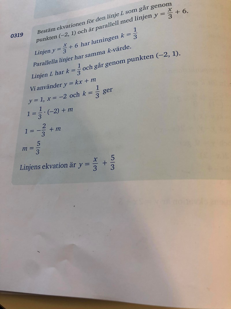 k = 1/3, därmed komemr g(x) har lutningen 1/3. vi tecknar ett uttryck för g(x)., vi har en punkt redan, vi stoppar in i g(x) och löser ut m.
