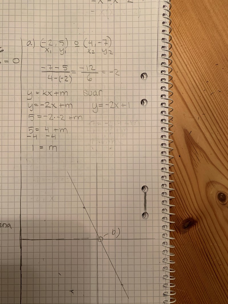 Här tog jag först reda på k värdet och satte sedan in det i räta linjens ekvation. SVAR: y = -2x + 1