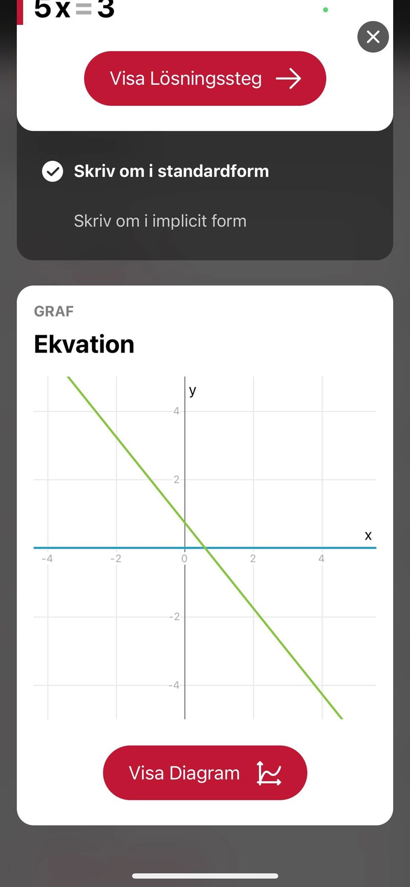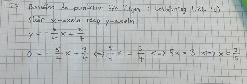 Här ser ni lutningens ekvation. Jag fick delvist rätt men det står även att x skär y när x är 0 men det är helt ologiskt enligt mig. Linjen går ju inte genom 0