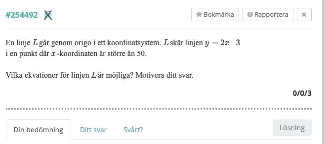 jag fifflade med Geogebra och fick en linje som uppfyllde kraven men det är väl dåligt att gissa sig fram?