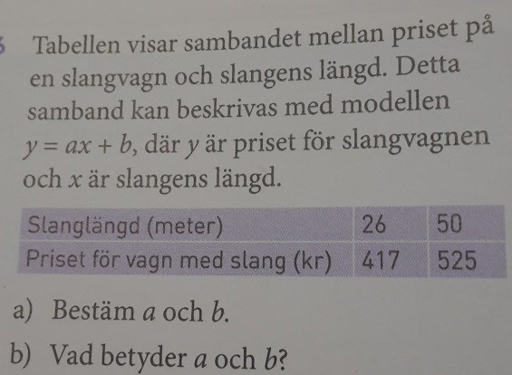 Så a = 4,5 Pris för slang/m och b = 300 Pris för slangvagnen