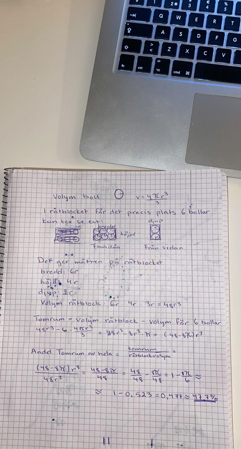 Nils köper bollar som ligger i en rätblocksformade förpackning. Det får precis plats sex stycken bollar i förpackningen. Hur stor är andelen tomrum i förpackningen? (I denna uppgift får man använda räknare)