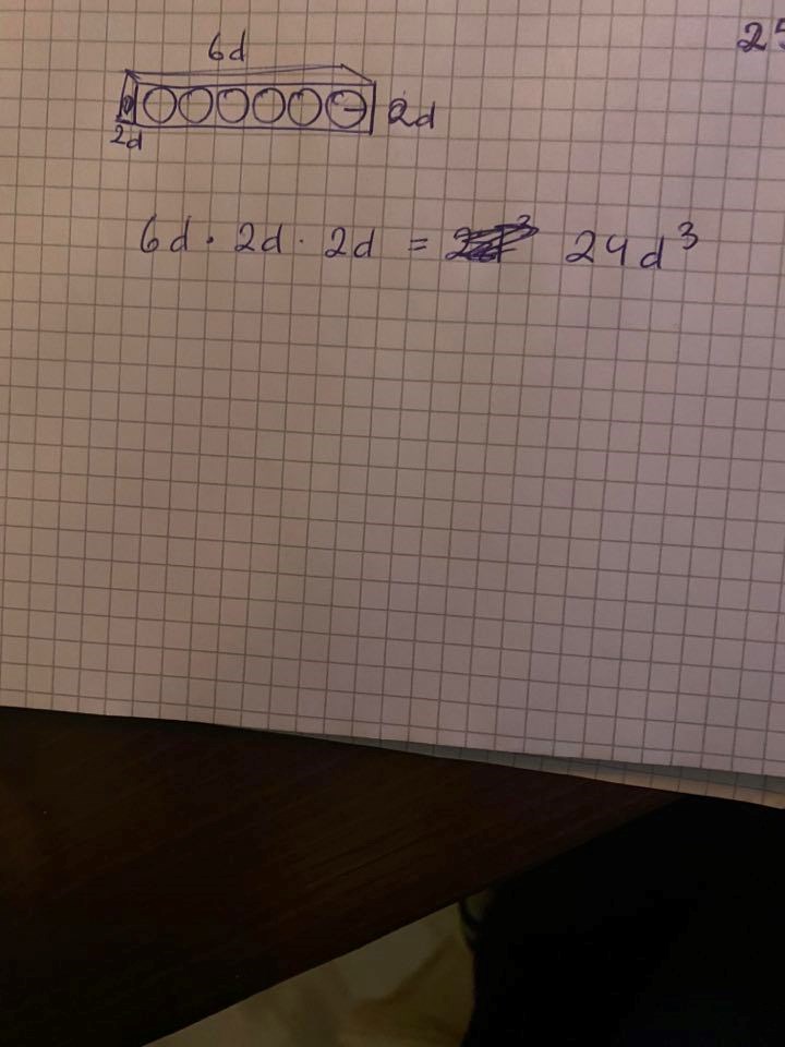 Så om jag ritar upp så blir h = 2d, l = d b = 3d i rätblocket då är bollarna upp ritade så de ligger tre bredvid och tre till under.