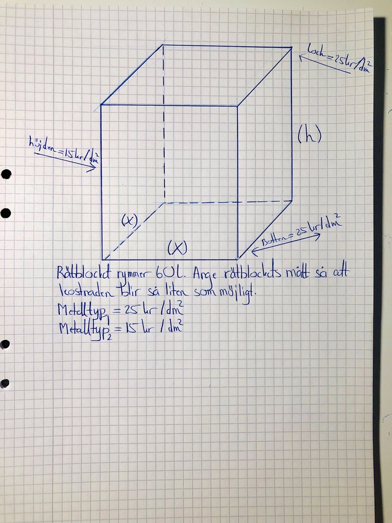 Ange rätblockets mått så att kostanden blir så liten som möjligt. Botten och locket har en metalltyp för 25kr/dm^2. Sidorna som jag även betecknar som (h) = höjd har en metalltyp för 15kr/dm^2.