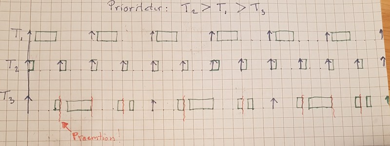 Min fråga berör första deluppgiften, dvs schemaläggning genom att använda rate-monotonic. Enligt min skiss verkar alla tre tasks möta sina deadlines (deadline = period) så verkar det funka: