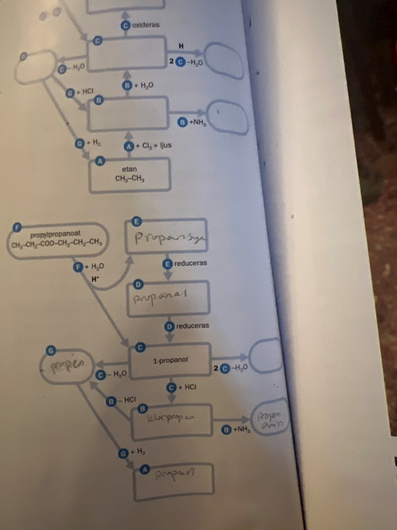Ska B vara 1-klorpropan och B + NH3, vara 1-propanamin.
