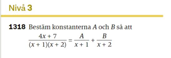 Det här kallas att IDENTIFIERA. Det betyder att likheten ska gälla för VARJE x (altså inte bara för ett x). Det kan bara gälla om x-termerna på VL och HL har samma koefficient och att resp. bekanta termer är lika. Nu har jag inte kollat om du har räknat rätt fram till dina ekvationer. Men om så skulle vara fallet så gör du så här: 4x+7= (A+B)x +2A+B. I VL är x-koefficienten lika med 4 i HL är den (A+B). De måste vara lika, alltså A+B=4. De bekanta termerna ska också vara lika, alltså: 2A+B=7. Nu har du ett ekv syst att lösa så får du ut A och B. Men kolla först att du har räknat rätt fram till dina ekv.