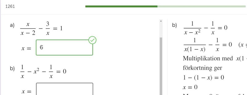 Nej, x = 0 är inte en lösning till b-i-högerspalten. Det är inte tillåtet att dividera med 0.
