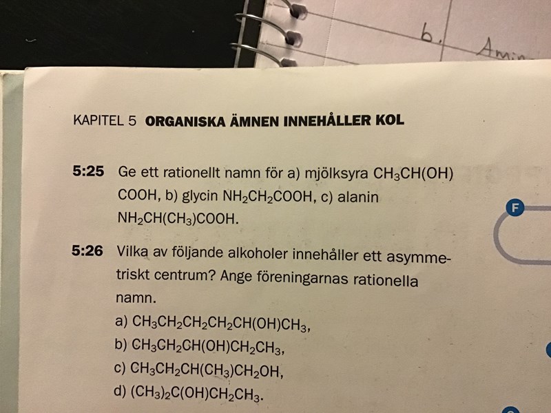 hej, på uppgift 5.25 c) får jag svaret till 2-metyl-2-aminoetansyra. Men enligt facit blir svaret 2-aminopropansyra. Förstår inte hur det går till då den längsta ogrenade kolkedjan består av 2 kol, alltså borde ändelsen vara -etansyra och inte propansyra, dessutom förstår jag inte varför metyl inte ör med i det rationella namnet, är inte den en substituent?