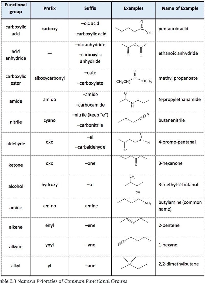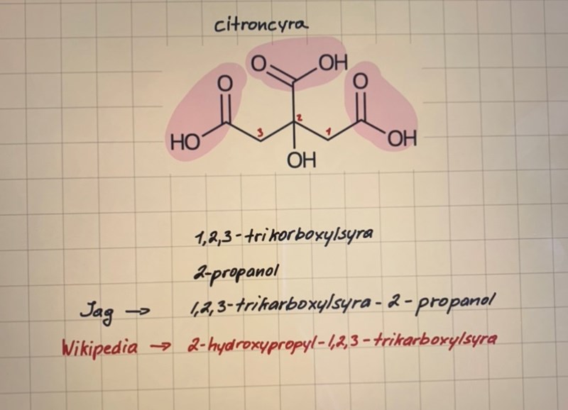 Det finns en prioritetsordning för de olika funktionella grupperna (sammanfattad i bilden), där karboxylsyragruppen har den högsta prioriteten. Så därför blir ämnet
