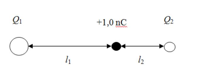 Utefter en rät linje ligger tre små laddade partiklar. De två yttersta partiklarna är negativt laddade medan partikeln däremellan är positivt laddad. Den positivt laddade partikeln har laddningen +1,0 nC.