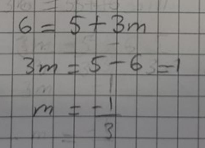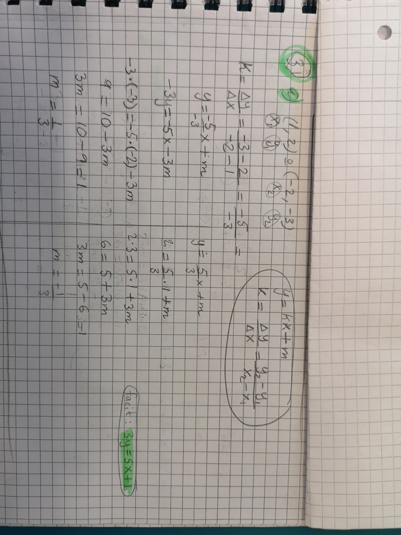 Bestäm en ekvation för linjen genom punkterna (1,2) och (-2, -3) jag får bara fel på m värdet, vad har jag missat? (>_<)