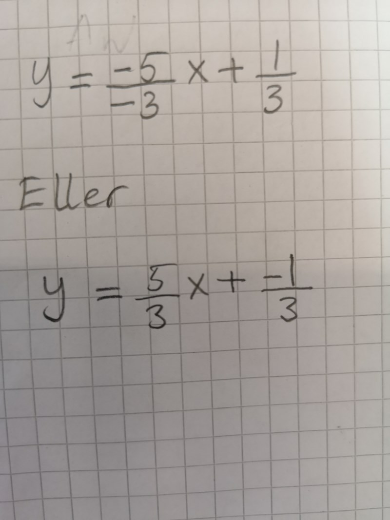 Först en kontrollfråga: Är ditt svar y=53x+13y=\frac{5}{3}x+\frac{1}{3}?