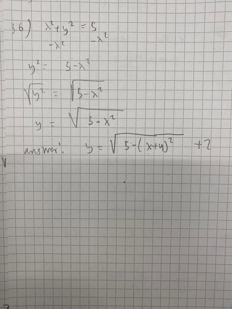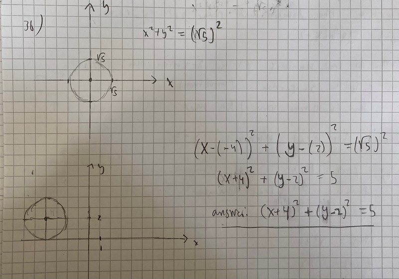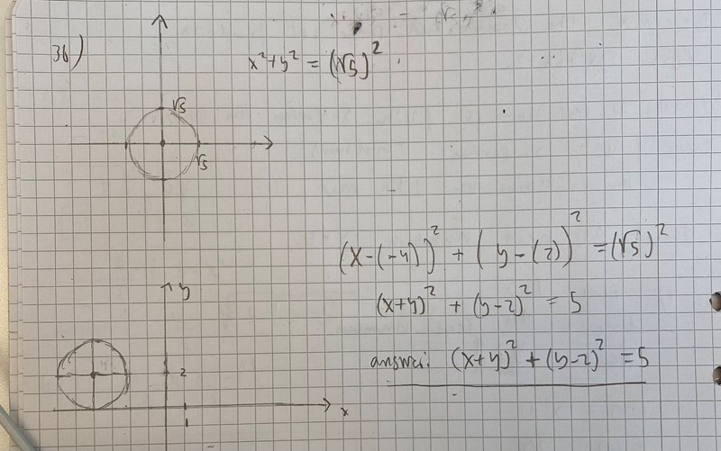 Det är det jag ritade UNDER min första ritning. Min första ritning representerar då cirkeln inte är flyttad, dvs när mittpunkten ligger i origo ( om man kollar på uppgiften dvs uppgift 36 så är cirkeln ekvation från början: x^2 + y^2 = 5 ) och min andra ritning representerar när cirkeln är flyttad.
