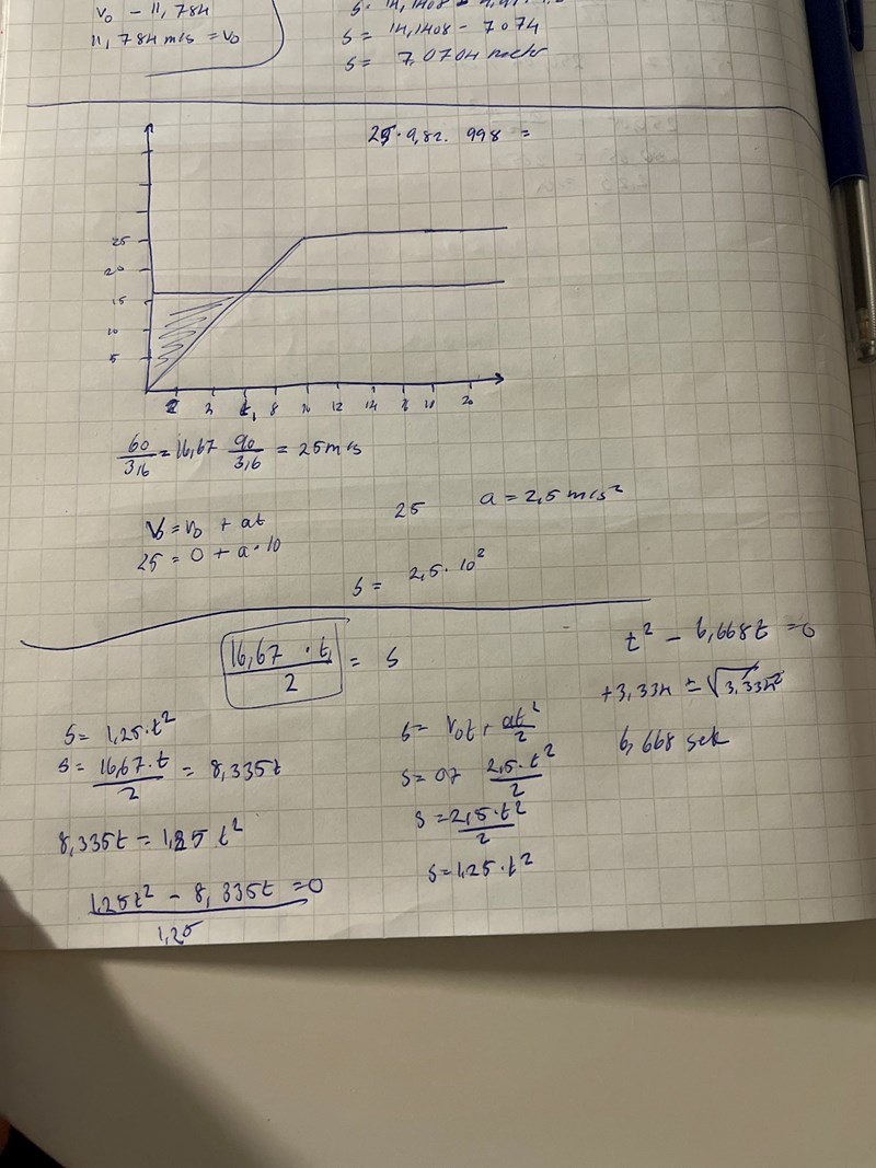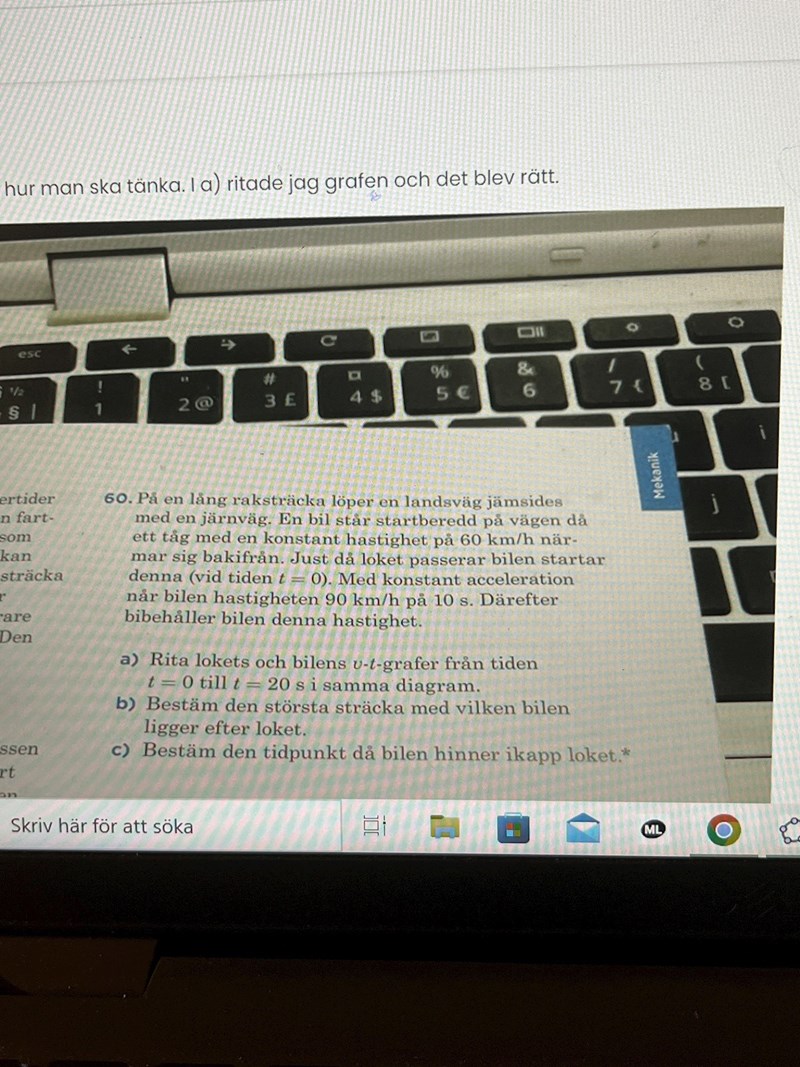 Uppgiften kan man lösa om man delar upp bilens rörelse i två delar, dess rörelse när den accelererar och dess rörelse när den når konstant hastighet. Vid t=0 befinner sig både loket och bilen vid sträcka 0 och vi ska beräkna den t efter t=0 då loket och bilen befinner sig på samma plan igen, alltså när de befinner sig på samma avstånd från startpunkten.
