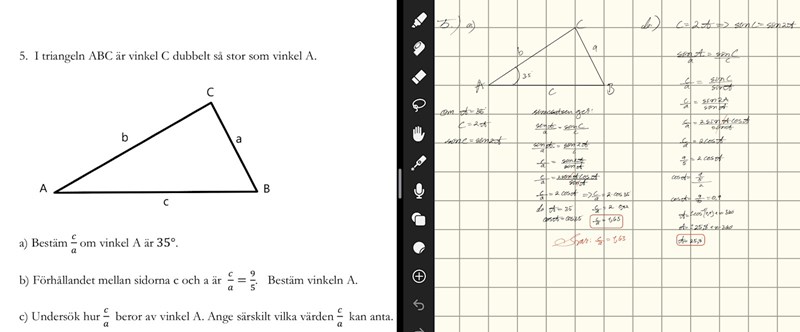 Tips på c-uppgiften: Utgå från sambandet ca=2cos(A)\frac{c}{a}=2\cos(A).