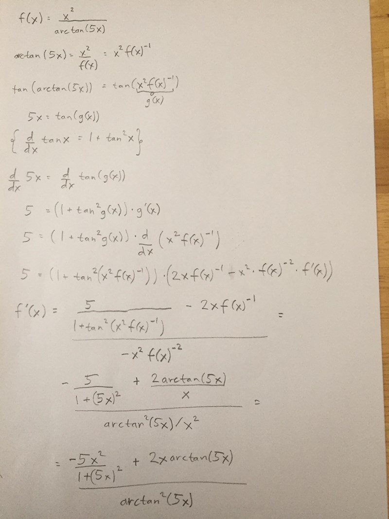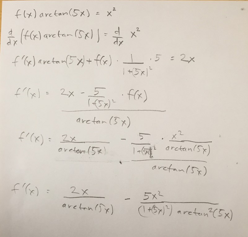 ... jag ser att i uttrycket 2xarctan(5x), går arctan5x bort mot arctan5x i kvadratt i den gemmensamma nämnare, men borde inte uttrycket multipliceras med med 1+25x^2?