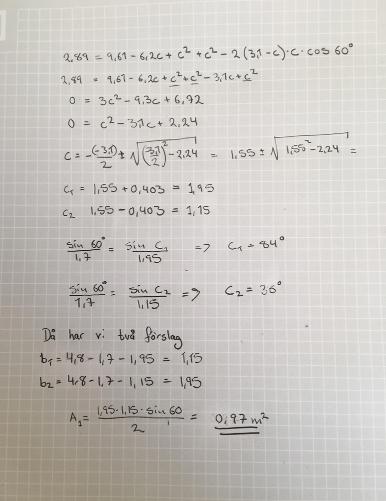 Nu kan sinussatsen användas och man får att arean blir (ab*sin60)/2 = 2,24*/4 = 0,97 m².