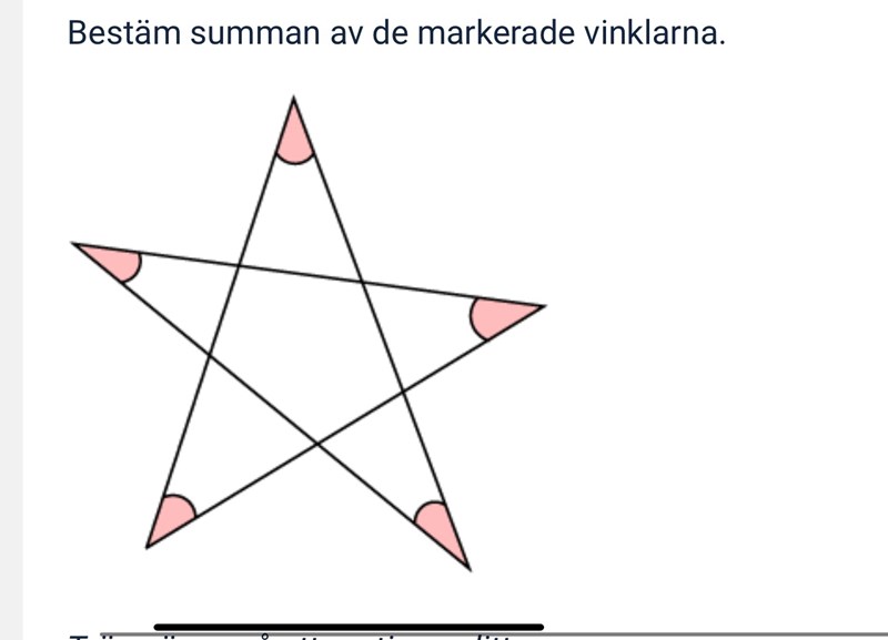 Blir summan av vinklarna 260 grader? Tänkte att en femhörning har vinkelsumman 540. En vinkel blir då 108 grader. Trianglarna är likbenta därför blir deras basvinklar samma. 52 grader.