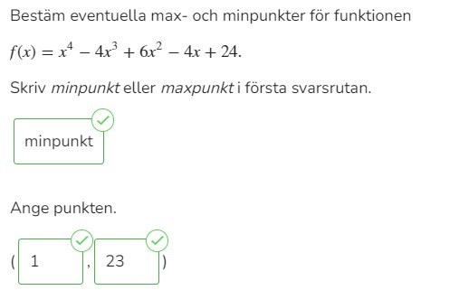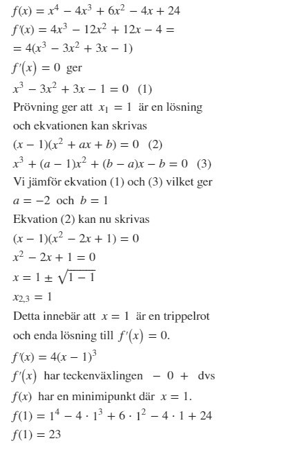 Jag hade bara enkelt gjort en ekvation för f'(x) = 0 alltså x3-3x2+3x-1=0 och sedan insett att x = 1 verkade rätt rimligt efter prövning, eftersom det var så många variabler. Sen bara enkel prövning av om derivatan var större eller mindre än noll runt x värdet 1 för att se om det var min- eller maxpunkt. Detta gav mig så klart svaret på hela uppgiften vilket kändes för enkelt då den var markerad som avancerad, det var då jag kollade facit (bild#2) och inser då hur mycket mer invecklat det verkade vara. T.ex. har jag aldrig stött på i Ma2b eller Ma3b (än så länge) mönstret för (a-b)3 som händer när dom visar 4(x-1)3 , vilket verkade ha varit viktigt för att förstå att det var en trippelrot.
