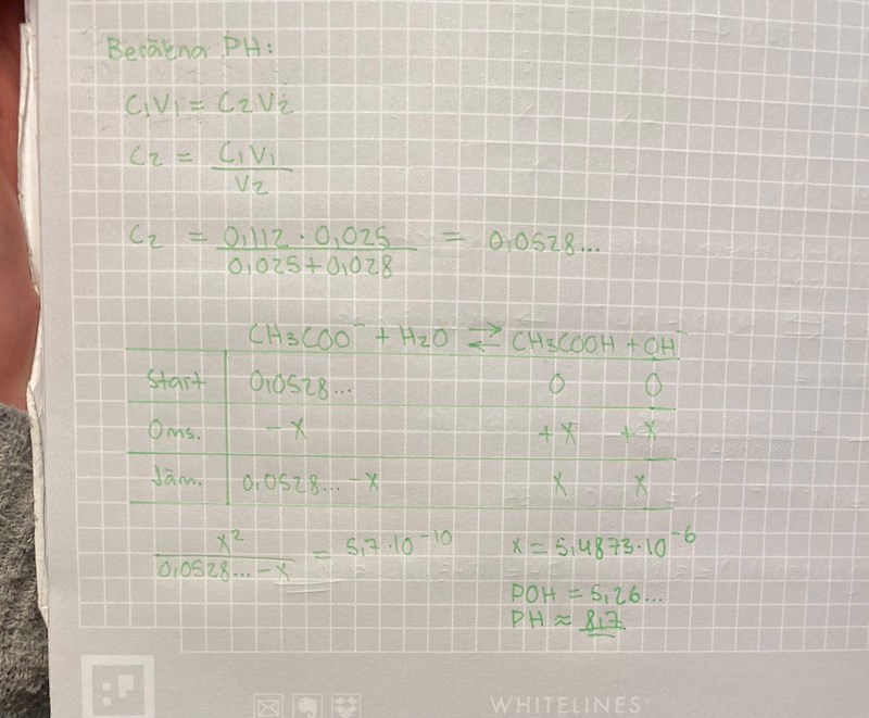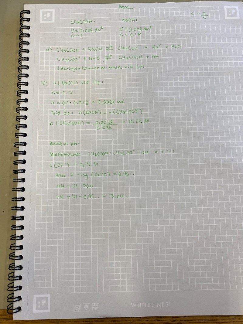 Cool123 skrev:Hej! Jag skulle räkna ut koncentrationen ättiksyra utifrån en titrering med NaOH (ni ser all info på bilden). Uträkningen av koncentrationen gjorde jag rätt då jag fick samma som i facit. Dock skulle man också räkna ut Ph för lösningen vilket jag gjorde men det finns inget svar i facit. Jag undrar därför om uträkningen för PH ser rätt ut? Jag borde iaf vara på rätt spår eftersom jag fick ett basiskt PH vilket är logiskt då man får ett basiskt PH vid EP när man titrerar en svag syra med en stark bas.