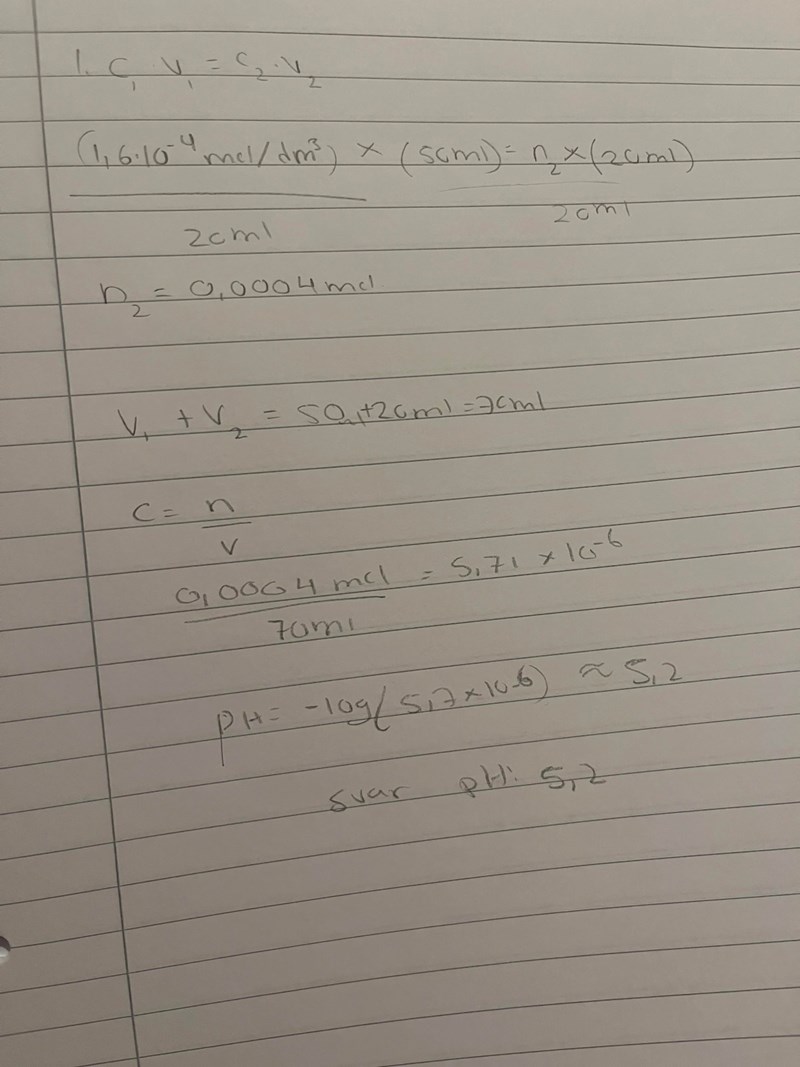 50 ml av den okända lösningen blandas med 20 ml citronsaft med pH 2,9. Vad är pH värdet i nya lösningen?