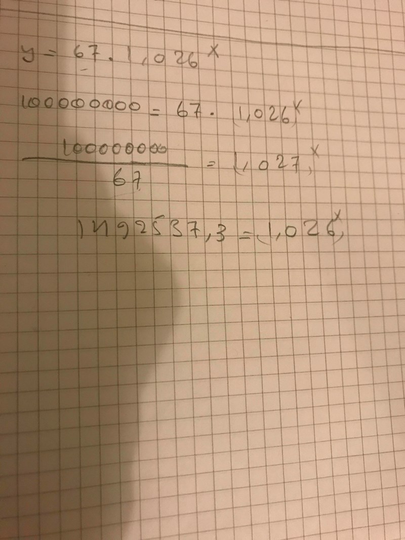 Du måste tänka på att y är i miljoner. Så när y = 1 så har du en miljon, när y = 100 så säger modellen att det är hundra miljoner invånare.