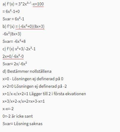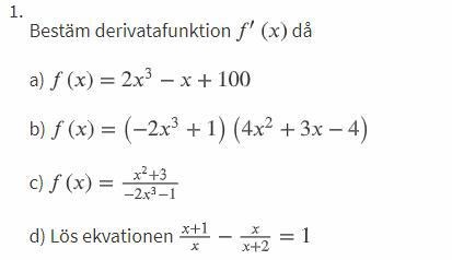 b är fel. multiplicera in parenteserna och sedan derivera.