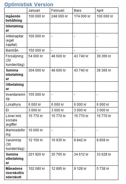 Frågan: Skapa två likviditetsbudgetar för årets fyra första månader. En försiktig och en optimistisk budgetversion enligt förutsättningarna från förra uppgiften. Bortse från moms.