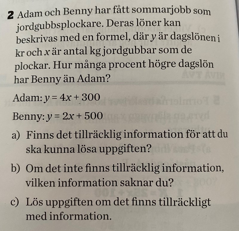 Även rätt svar på fråga b, men det vore snyggare att istället för bara "x" svara att det som saknas är information om hur mycket jordgubbar de plockar.