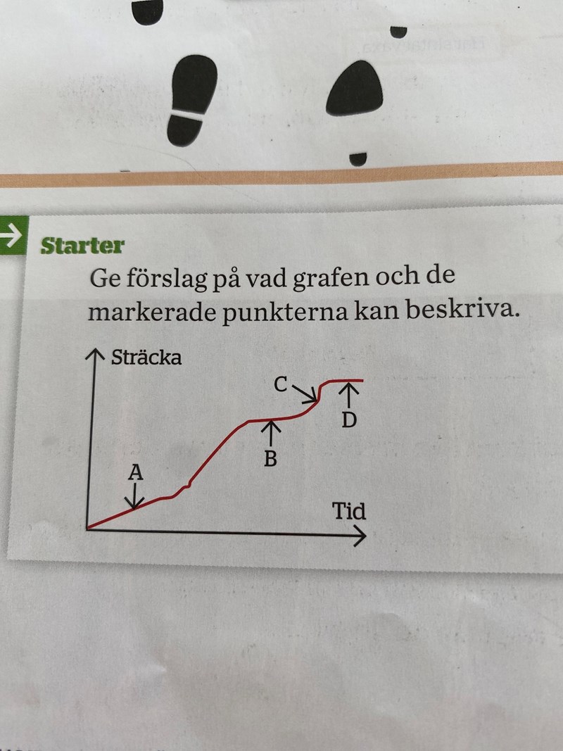 Det verkar som om du tror att det är hastighet på y-axeln, men det står "sträcka"! En vågrät linje betyder alltså att man står stilla.