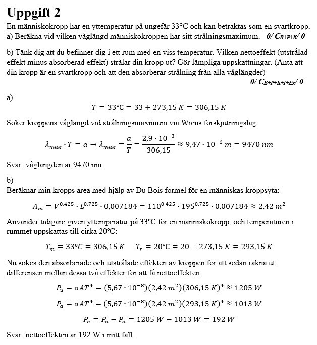 "2)Delvis korrekt svar med godtagbart resonemang och förklaringar. Rätt på a men inte b. Rätt svar: a) 9,5 mikrometer, alltså i det infraröda området. b) mellan 110-160W. Tips: a) Använd Wiens förskjutningslag och diskutera i vilket område strålningen ligger. b) Arean av en människokropp är ungefär 2 m² (du får uppskatta själv). Anta att rummets temperatur är 20°C. Detta ger den utstrålade respektive den instrålade effekten. Då kan du räkna ut nettoeffekten. Kommentar: detta är ett uppskattat värde, räknar man på att arean är 1,5 m² får man ca 120 W. Räknar man dessutom med att en kropp till 95 % absorberar (och emitterar) all strålning fås ca 110 W, vilket ligger nära det ”verkliga” värdet. Genom att lösa en del av uppgiften har du visat att: Du har grundläggande kunskaper om naturvetenskapliga begrepp och visar det genom att använda dem i välkända sammanhang på ett i huvudsak fungerande sätt."