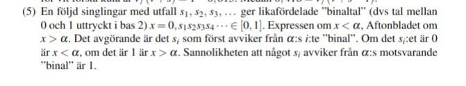 Tack, förstår vad facit tänker nu. Lite osäker på varför det är likformigt fördelat, har du något tips på hur jag tan tänka? Och det finns ingen alternativ lösning som inte bygger på att man skapar ett långt decimaltal utan att man istället t.ex. betraktar varje slantsingling separat och adderar/multiplicerar ihop de olika singlingarna? Jag tyckte mest att facits lösning kändes väldigt specifik, snanare än att det bygger på någon av teknikerna som gåtts igenom i de föreläsningar som uppgiften hör till (som främst fokuserade på addition- och multiplikationsprinciperna).