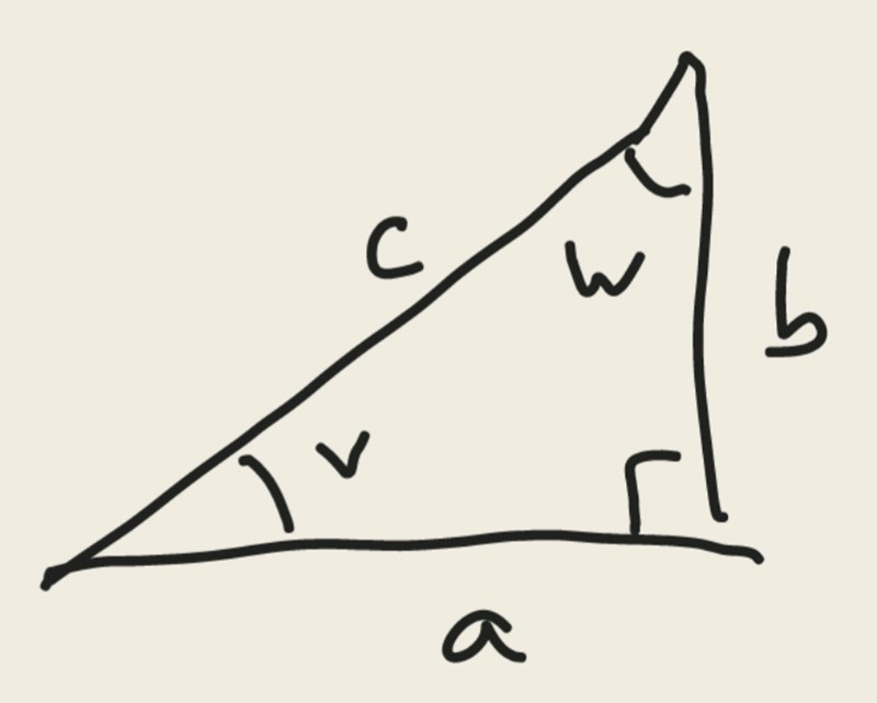 Vi tar en rätvinklig triangel med vinklar v och w samt sidlängder a, b och c (se bild).