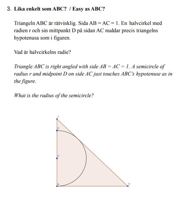 Allt jag har kommit fram till är att från mittpunkten D kan jag dra en radie till var halvcirkeln tangerar hypotenusan. (Sen vet jag naturligtvis att hypotenusan är roten ur 2).