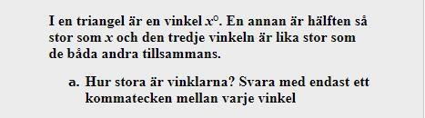 Vad blir x? vad blir den andra vinkeln? Vad blir den tredje vinkeln?